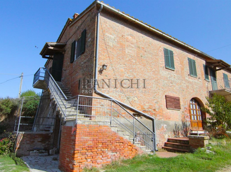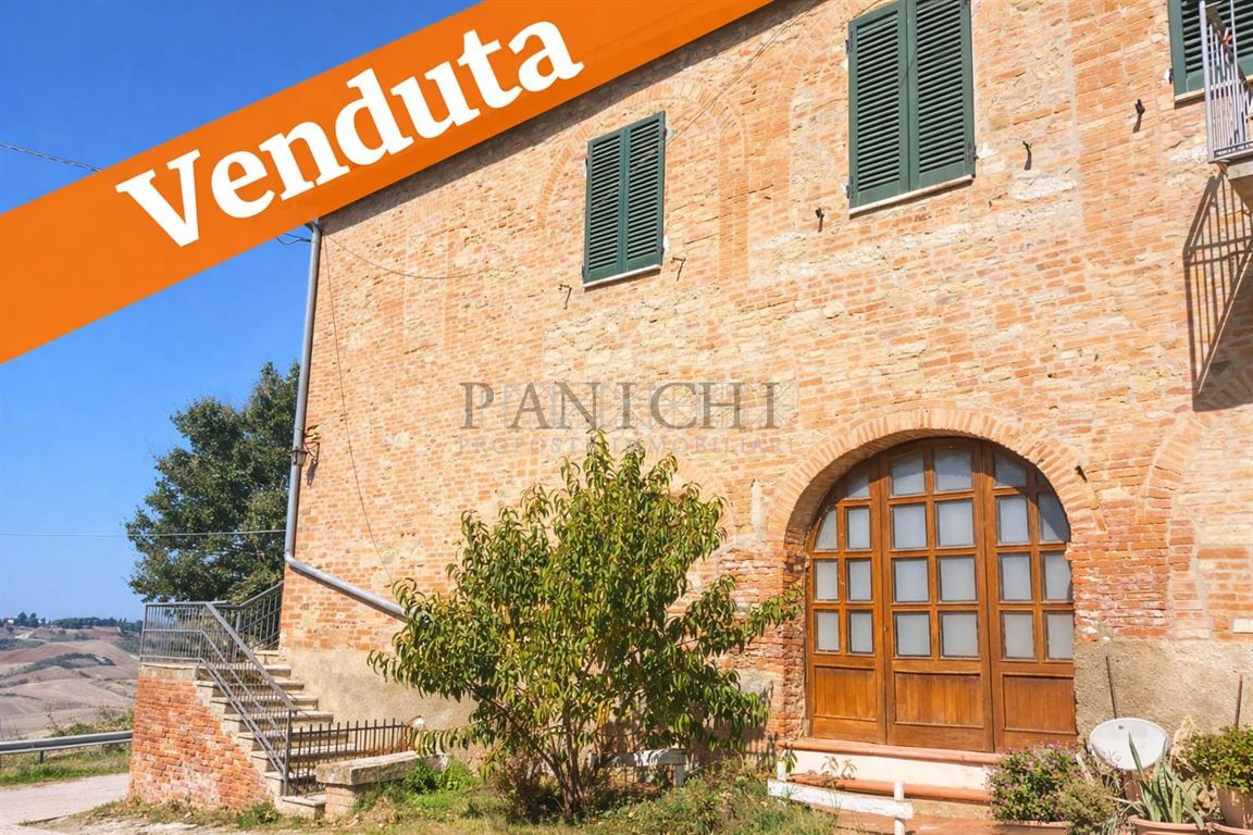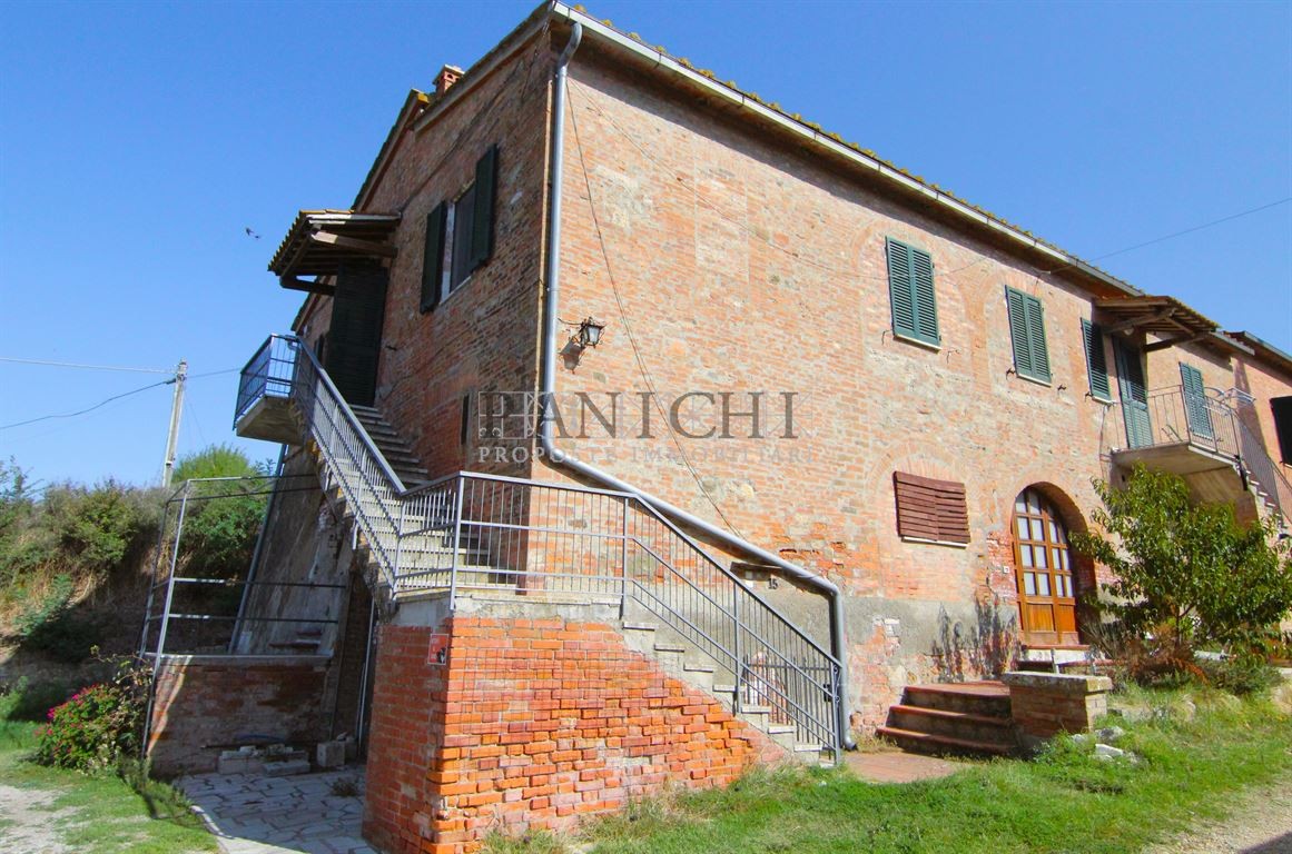 Venduta nel cuore delle crete senesi, lungo la strada panoramica che collega Asciano alla citta di Siena, testata di casolare toscano con annesso magazzino e terreno. La proprietà è porzione di testata di fabbricato bifamiliare e si sviluppa su 2 livelli collegati internamenti tra loro ma entrambi con ingresso privato sia dal piano terra che dal piano primo. Al piano terra vi è un ampio locale rustico con cucina e forno a legna, wc, ripostiglio, locale tecnico e altro locale rustico con caratteristico arco a mattoncini in stile classico toscano.. Al piano primo si trova l’appartamento composto da corridoio d’ingresso, soggiorno con caminetto e cottura, 2 camere matrimoniali, eventuale terza camera o salotto, wc e ripostiglio. Della proprietà fa parte anche porzione di magazzino in fabbricato antistante, suddiviso in 2 locali con accessi separati ma collegati tra loro internamente. Nel magazzino più grande è stato recentemente rifatto il tetto. Completano la proprietà 2 porzione di terreno, una circostante gli immobili di circa 1.200 mq a l’altra nei pressi della proprietà di altri 7.600 mq con 25 piante di olivo in produzione. La proprietà ha il vantaggio di potere essere utilizzata sin da subito senza dover necessariamente fare interventi di manutenzione, oppure valorizzata potendo sfruttare al meglio il potenziale degli ambienti, sia del corpo principale, magari realizzando 2 appartamenti indipendenti, così come i magazzini. E’ una soluzione adatta a famiglie, anche numerose, che amano vivere nella natura ma alla giusta distanza da tutti i servizi che si trovano nei vicini borghi che distano solo 10 minuti in auto.