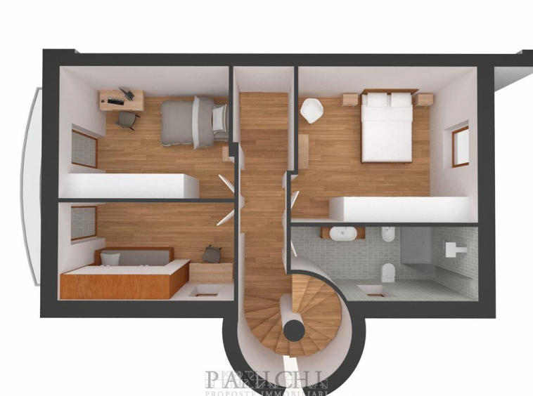 Il progetto prevede al piano terreno l’ingresso principale, ampio garage, vano accessorio e vano tecnico e un wc e da questo piano di ha accesso diretto al giardino su più lati del fabbricato. Dalla scala interna si raggiungere il primo piano che sarà predisposto per un’ampia zona living con cottura a vista o cucina, antibagno e bagno oltre ai terrazzi. Salendo ancora una rampa di scale si raggiunge il reparto notte al secondo piano che sarà predisposto per n. 3 camere, bagno e terrazzi.