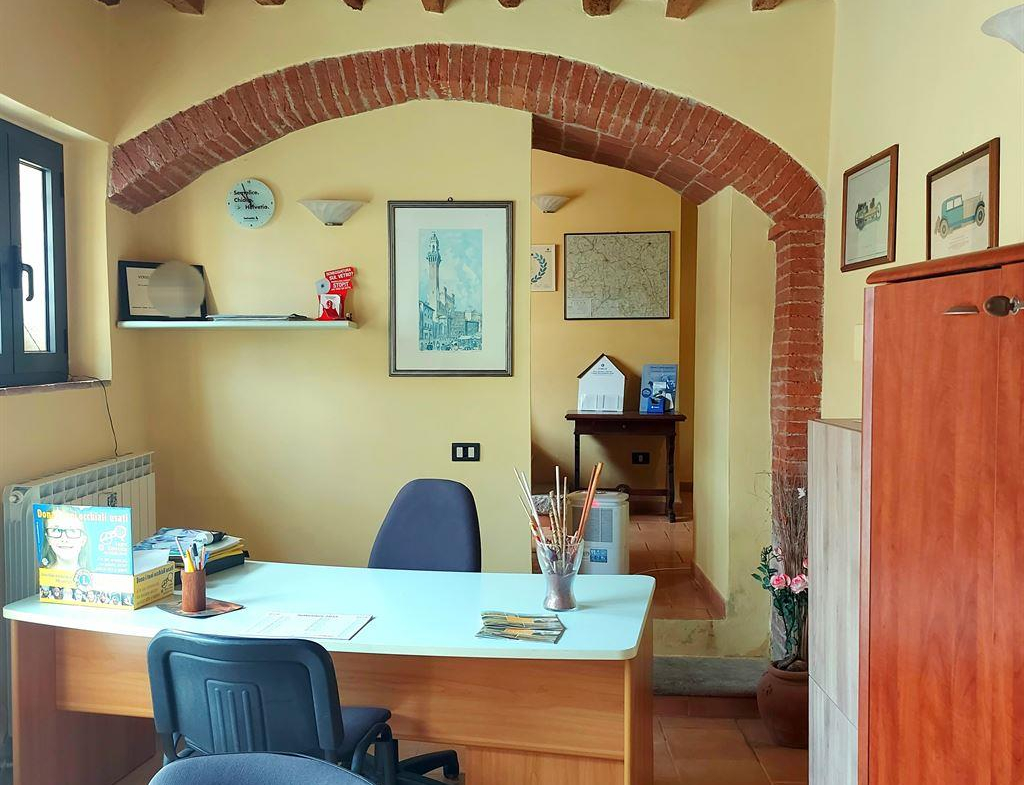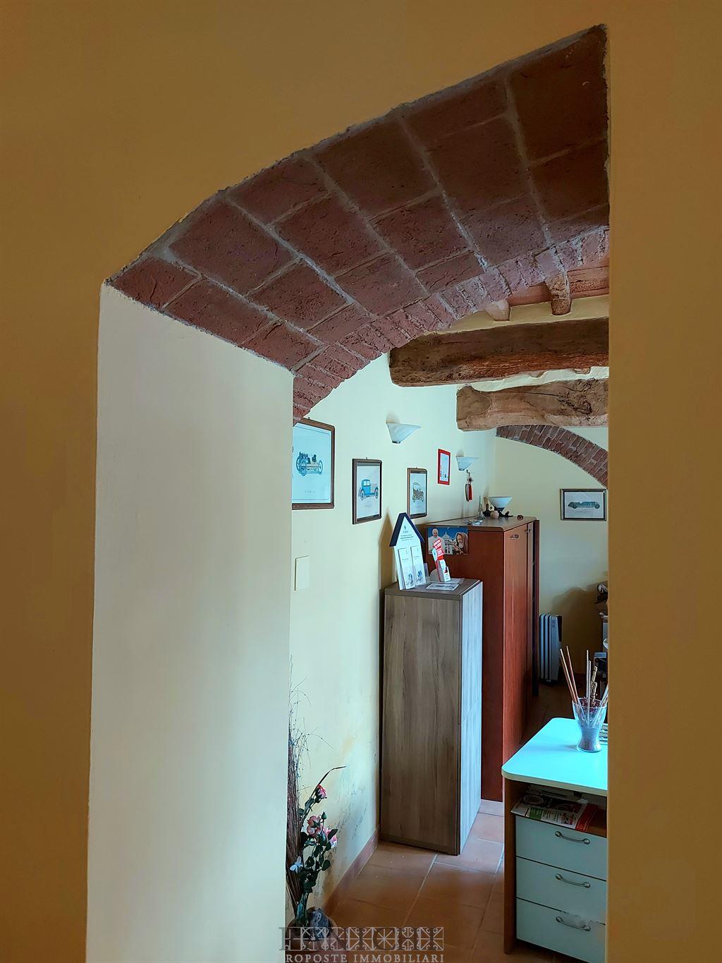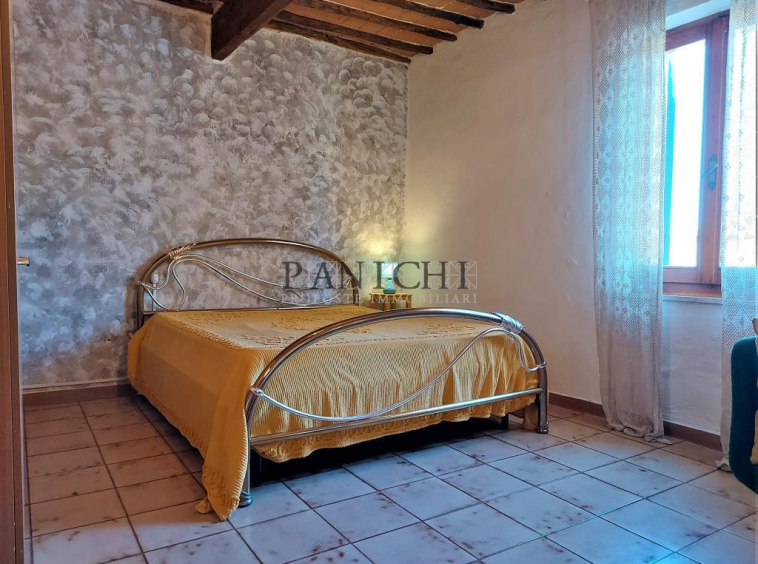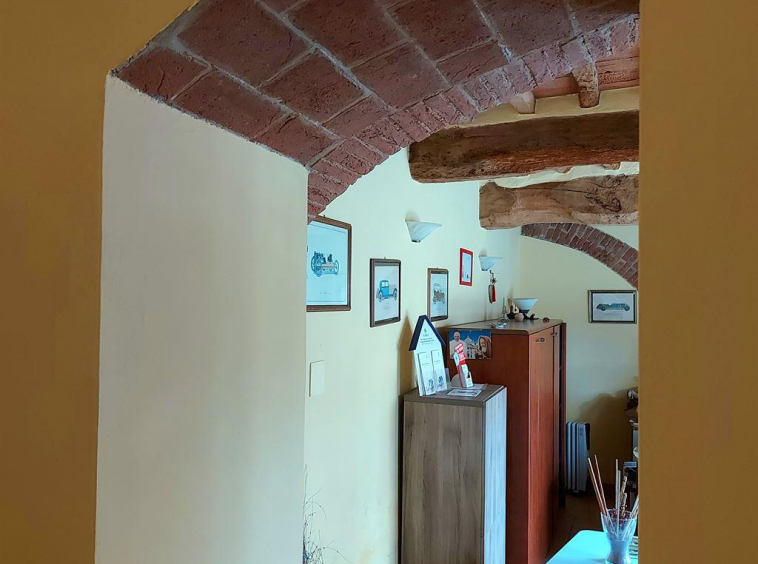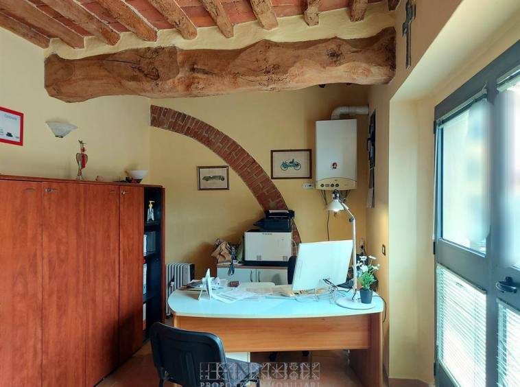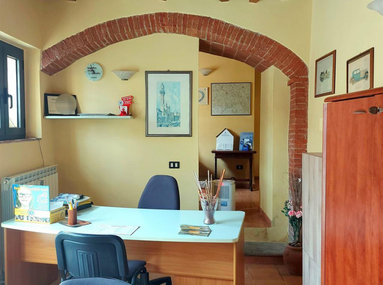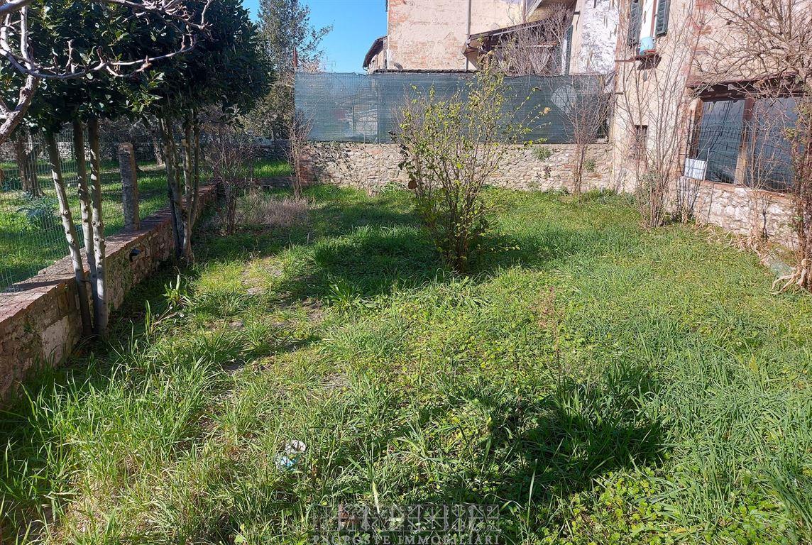 Ad Asciano si propone in vendita proprietà terratetto disposta su 3 livelli con giardino, appena fuori dal centro storico. L’accesso all’appartamento è tramite scala interna direttamente collegata al locale al piano terreno, attualmente ad uso commerciale, dove troviamo due locali con wc e collegamento diretto col giardino. Salendo al primo piano troviamo un salotto con caminetto e balconcino, wc, cucina abitabile, ripostiglio sottoscala, scala in muratura per il piano secondo composto da bagno e da 2 camere matrimoniali. La proprietà è stato parzialmente ammodernata. Le caratteristiche interne presentano le classiche finiture toscane con i soffitti a travicelli e mezzane e gli archi a mattoncini.