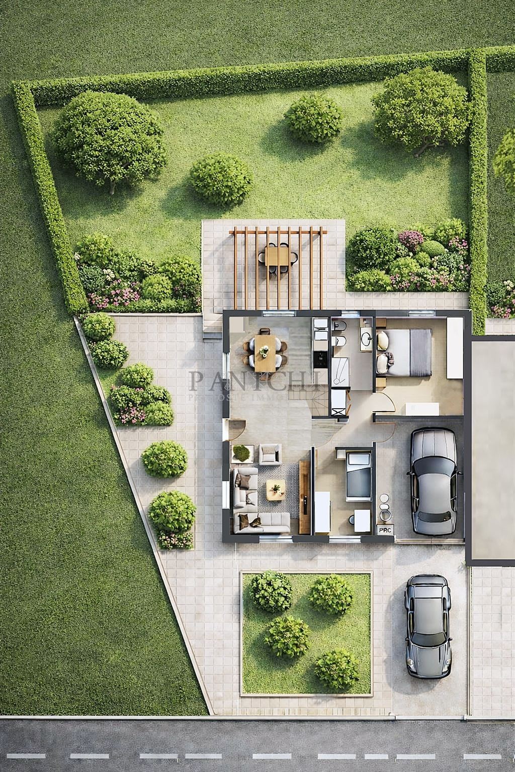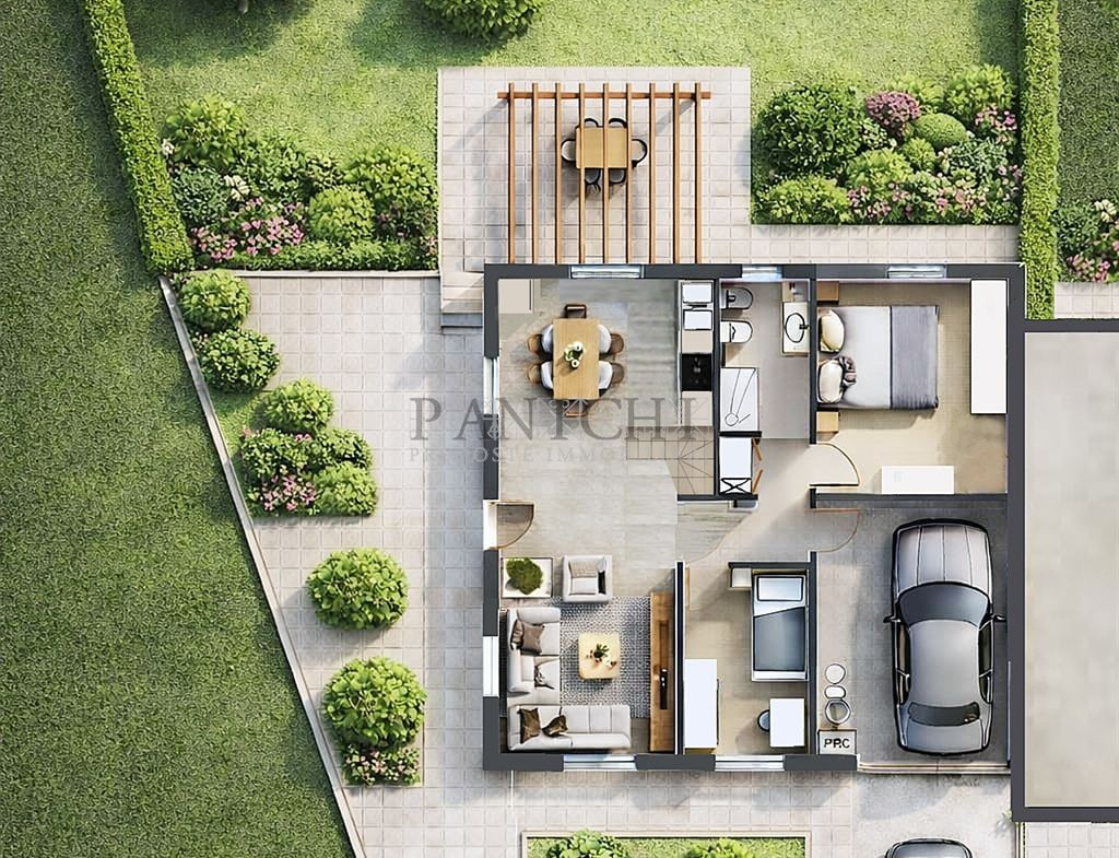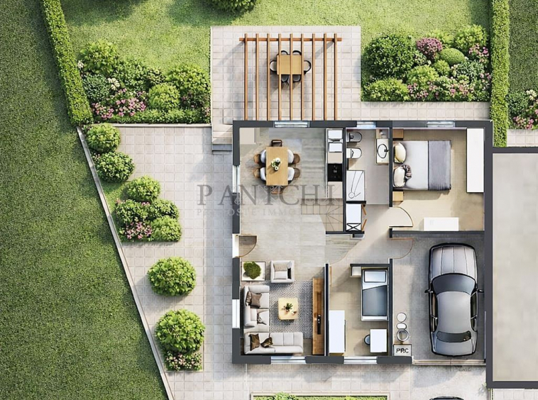 L’immobile è da realizzare ed il progetto prevede un ampio resede esclusivo che circonda l’immobile su tre lati, in parte destinato a giardino e in parte pavimentato. Al piano terra è presente il box auto, collegato internamente all’abitazione.