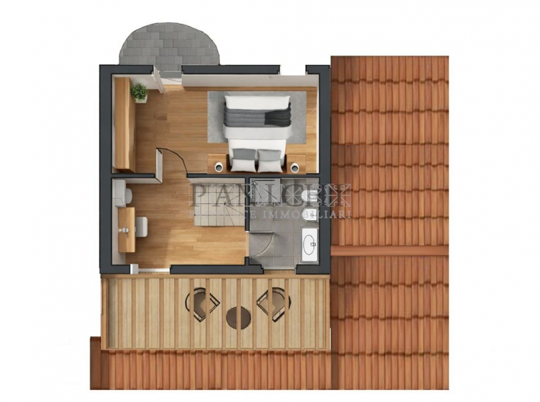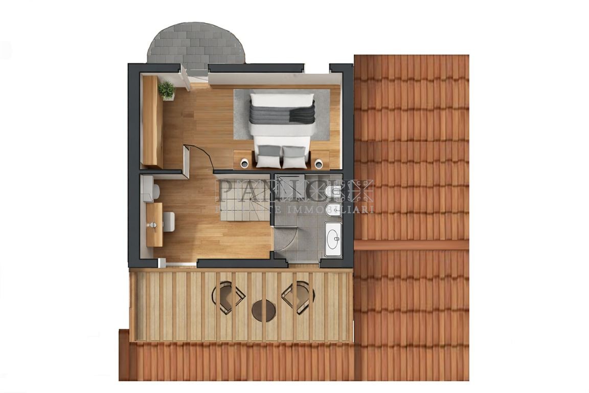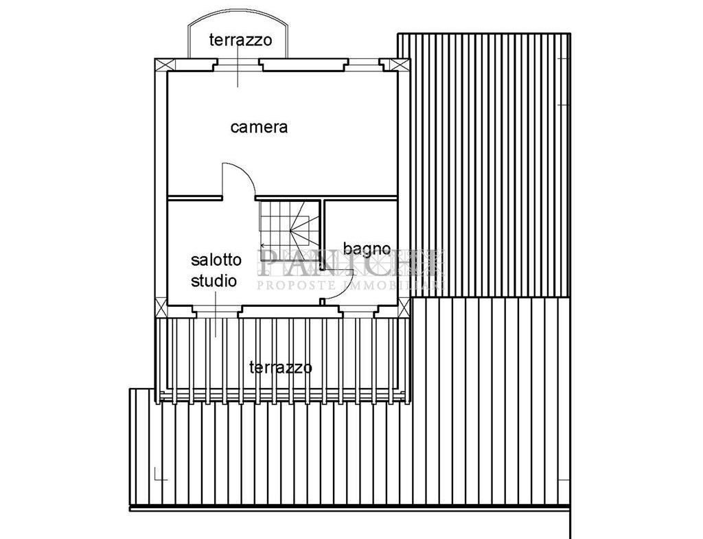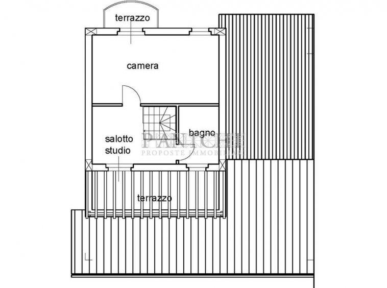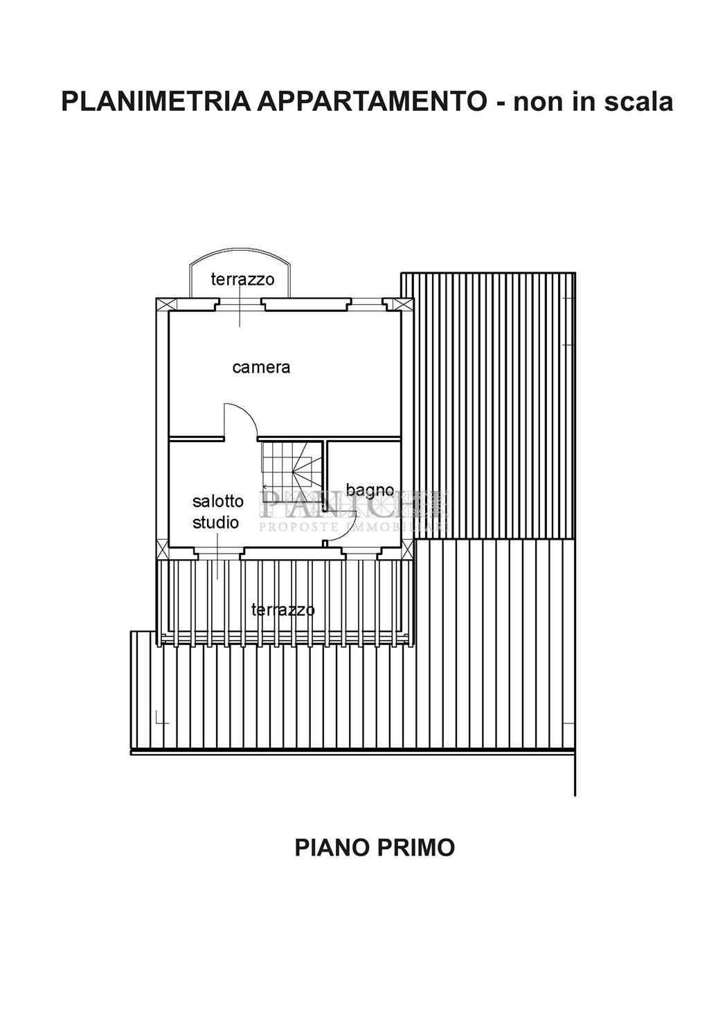 Una scala interna conduce al piano primo, dove è possibile realizzare una mini suite composta da salotto e bagno, con doppio terrazzo sia sul fronte che sul retro dell’abitazione.